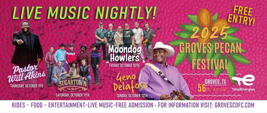 Groves Pecan Festival Groves, Tx October 9-12, 2025 4 days outdoor festival 6200 Jackson St, Groves, TX, United States, Texas 4 days outdoor festival. Free admission, live music Operating hours: Thursday 5pm to 10pm Friday 5pm to 11pm Saturday 1-am to 11pm Sunday 12pm to 6pm