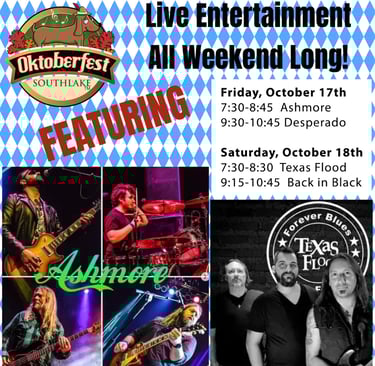 Oktoberfest is Southlake, Tx Dates: October 17–19, 2025 3 days outdoor festival Location: Southlake Town Square, 1400 Main St, Southlake, TX 76092 Admission: Free and open to the public! Operating hours: Friday 4pm to 11pm Saturday 10am to 11pm Sunday 11am to 7pm